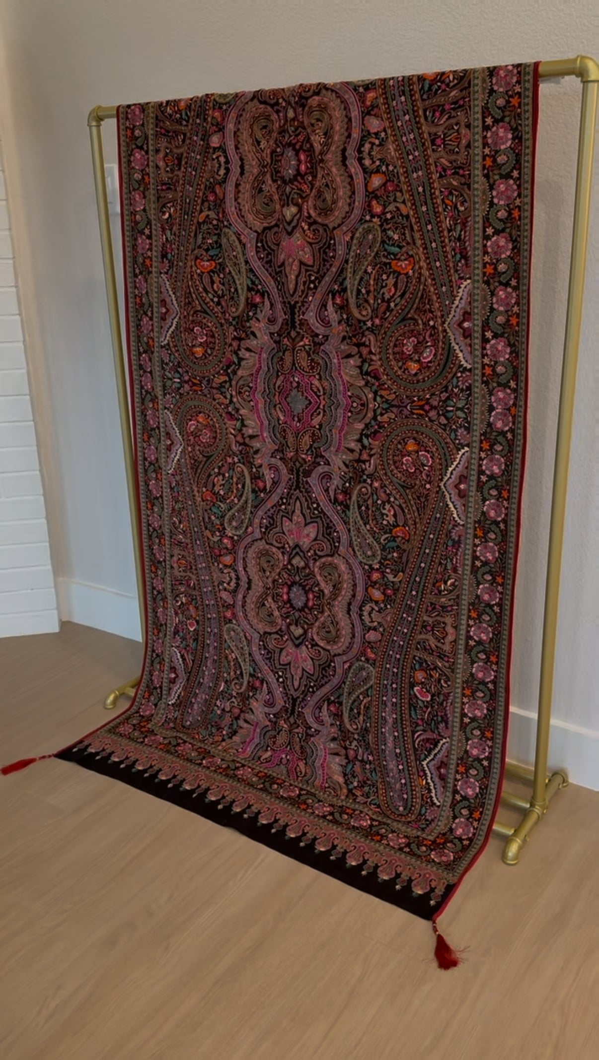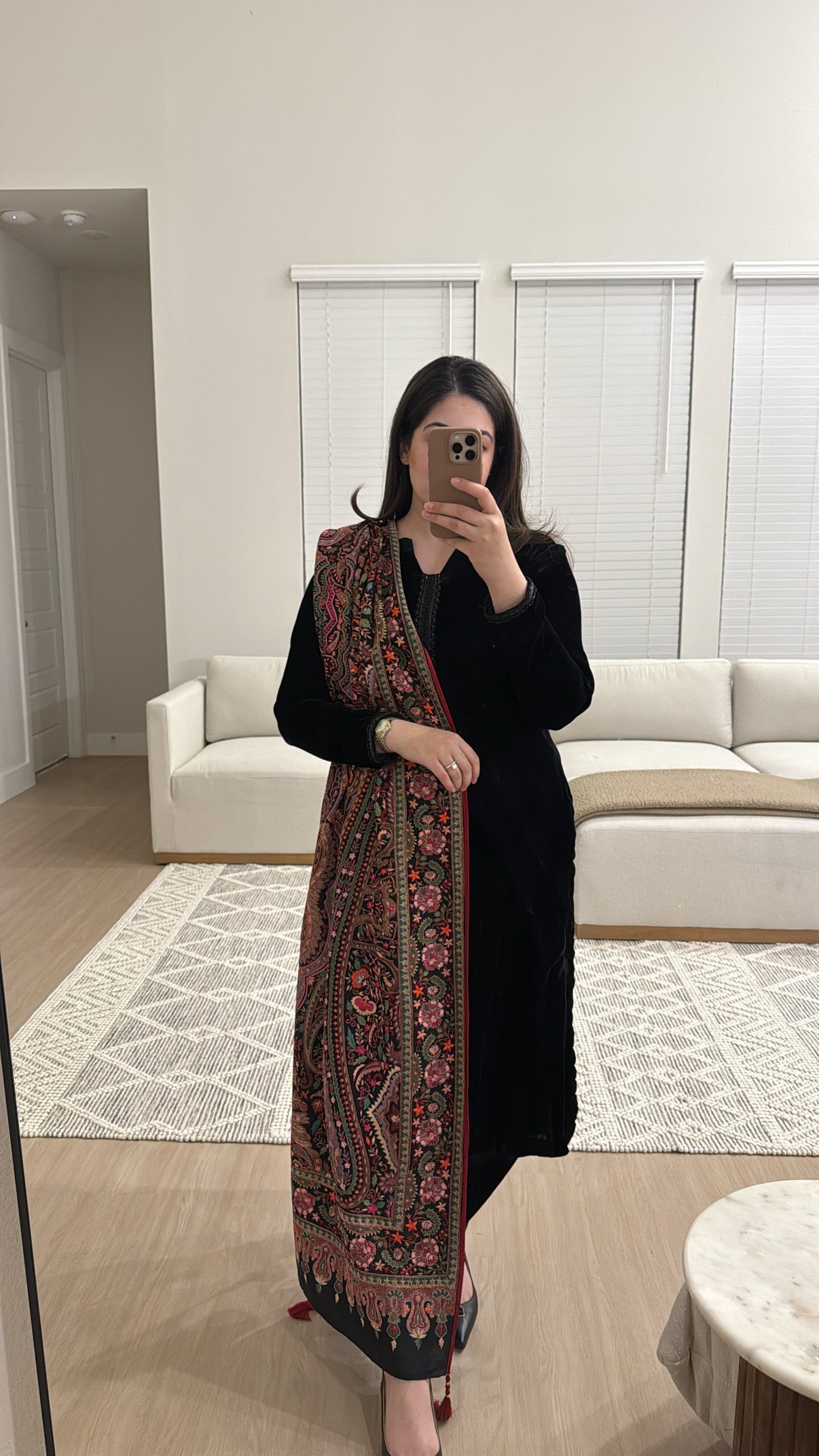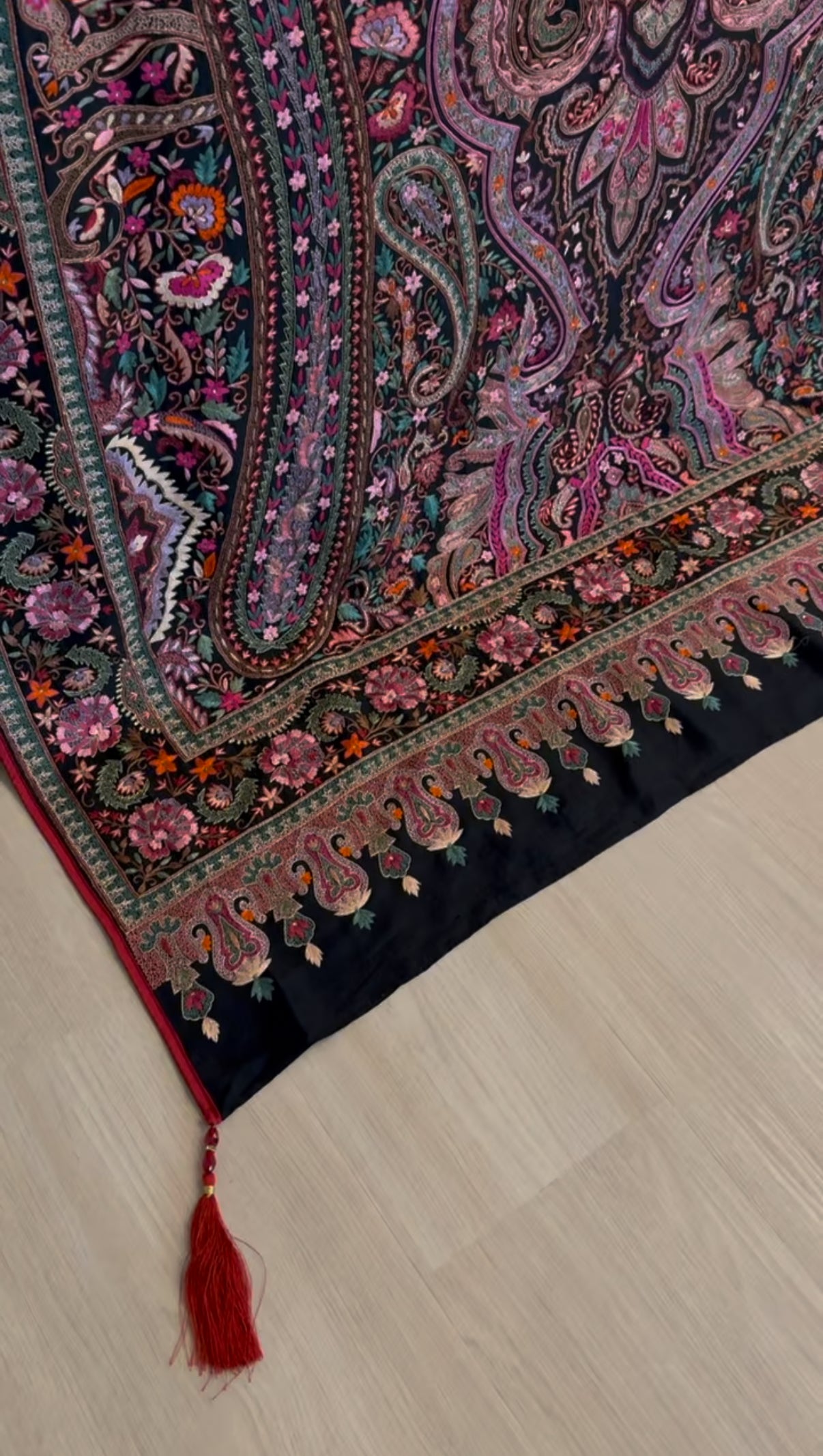 A black canvas brought to life — this 80 gram pure raw silk Kalamkari shawl is hand-embroidered with bursts of color, each stitch a celebration of craft, culture, and quiet luxury. Each motif is brought to life over weeks using centuries-old techniques, making this piece not just a garment—but a timeless heirloom.