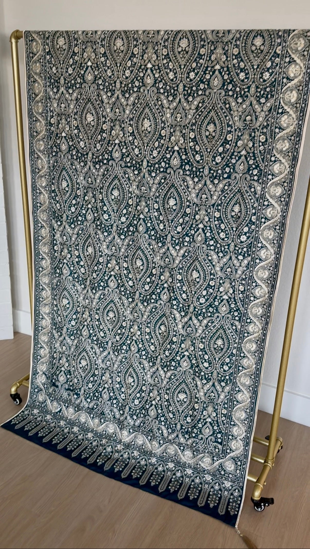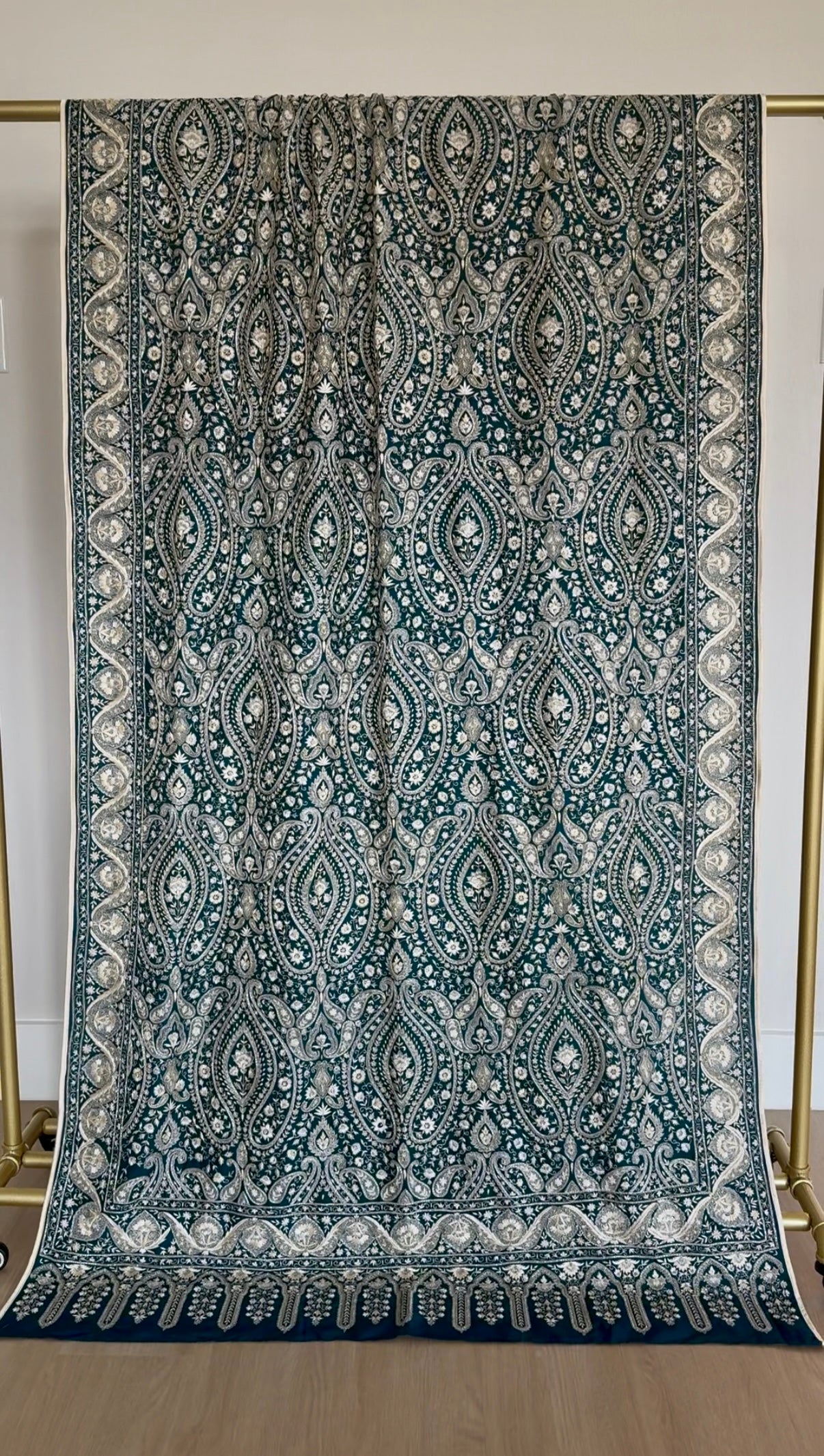 An elegant piece of art in motion—this pure raw silk shawl in deep teal is crafted from 80g premium silk, offering a graceful drape and gentle sheen. Delicate white paisley embroidery accented with subtle hand-done beadwork for a soft glimmer. Refined yet eye-catching, this shawl is perfect for both formal wear and elevated everyday moments. A timeless statement of quiet luxury.